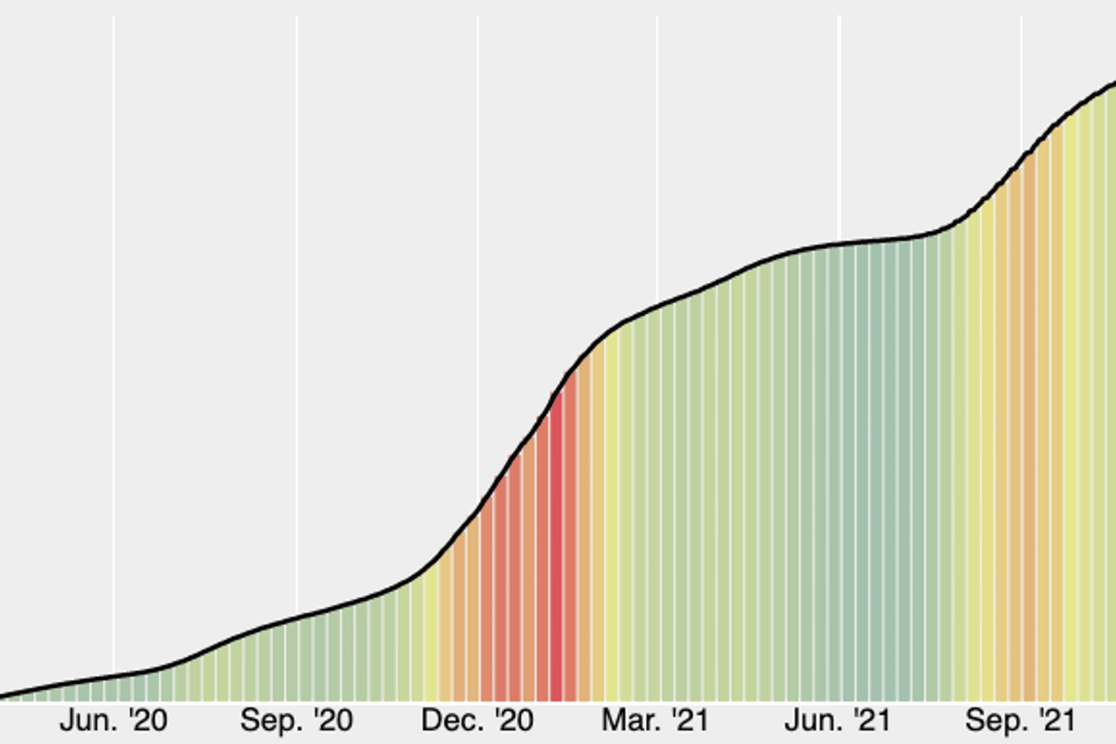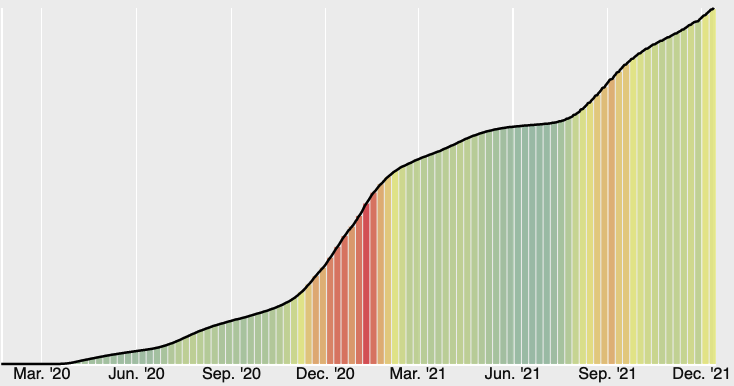 Let’s recall where we were a year ago. On Dec. 13, 2020, with the bloom in infections from Thanksgiving travel still in full effect as Americans packed for Christmas, the seven-day rolling average of new daily cases stood at 218,005. In the weeks that followed, a new million-case mark arrived every four to five days. Yesterday, the rolling average stood at 119,604, barely half of last year’s figure. As you can see, the rate of new infections, visualized by the color of the vertical bars below, is not nearly as angry as it was 12 months ago. (Tap “Weekly” to see the difference in relief.)