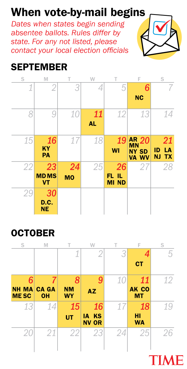 Voters in North Carolina are the first to receive their absentee ballots in early September—two months before election day. Several other states also open early voting in September including Alabama (Sept. 11), Kentucky (Sept. 16), Pennsylvania (Sept. 16), Wisconsin (Sept. 19), Arkansas (Sept. 20), Minnesota (Sept. 20), New York (Sept. 20), South Dakota (Sept. 20), Virginia (Sept. 20), West Virginia (Sept. 20), Idaho (Sept. 21), Louisiana (Sept. 21), New Jersey (Sept. 21), Texas (Sept. 21), Maryland (Sept. 23), Mississippi (Sept. 23), Vermont (Sept. 23), Missouri (Sept. 24), Florida (Sept. 26), Illinois (Sept. 26), Michigan (Sept. 26), North Dakota (Sept. 26), District of Columbia (Sept. 30), and Nebraska (Sept. 30).