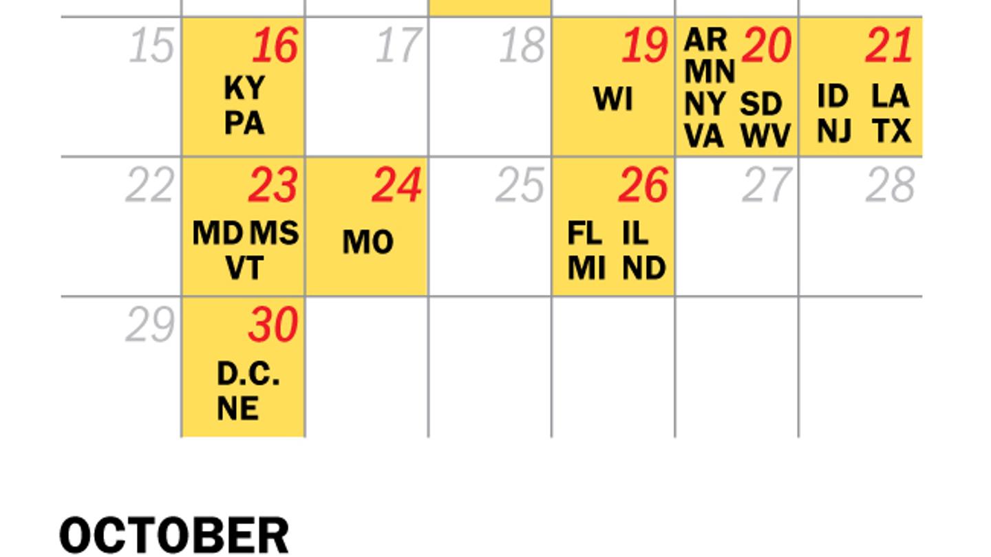 Other states will begin the process in October: Connecticut (Oct. 4), Maine (Oct. 6), Massachusetts (Oct. 6), New Hampshire (Oct. 6), South Carolina (Oct. 6), California (Oct. 7), Georgia (Oct. 7), Ohio (Oct. 7), New Mexico (Oct. 8), Wyoming (Oct. 8), Arizona (Oct. 9), Alaska (Oct. 11), Colorado (Oct. 11), Montana (Oct. 11), Utah (Oct. 15), Iowa (Oct. 16), Kansas (Oct. 16), Nevada (Oct. 16), Oregon (Oct. 16), Hawaii (Oct. 18), Washington (Oct. 18).